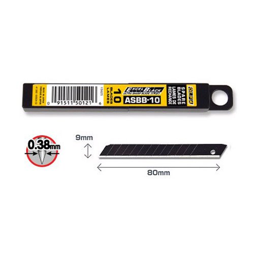 Olfa ASBB-10 to profesjonalne, czarne ostrze segmentowe o szerokości 9mm serii Excel Black. Dzięki zastosowaniu stali narzędziowej o podwyższonej twardości i specjalnie dobranym kątom ostrzenia - innym niż dla ostrza standardowego - uzyskano ostrze tnące wyjątkowo łatwo i dokładnie.Dane techniczne: