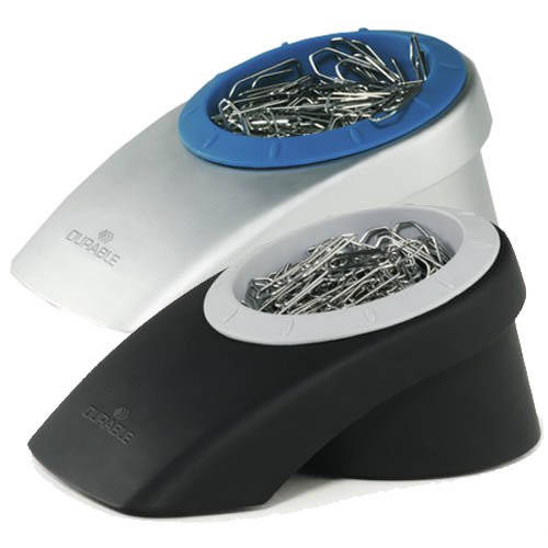 Pojemnik na spinacze. W opakowaniu dodatkowo 100 spinaczy. Wbudowany magnes pozwala łatwo wyjmować pojedyncze spinacze. Stabilny dzięki gumowym ogranicznikom na spodzie. Kolory: niebiesko - srebrny i popielato - czarny.Specyfikacja techniczna