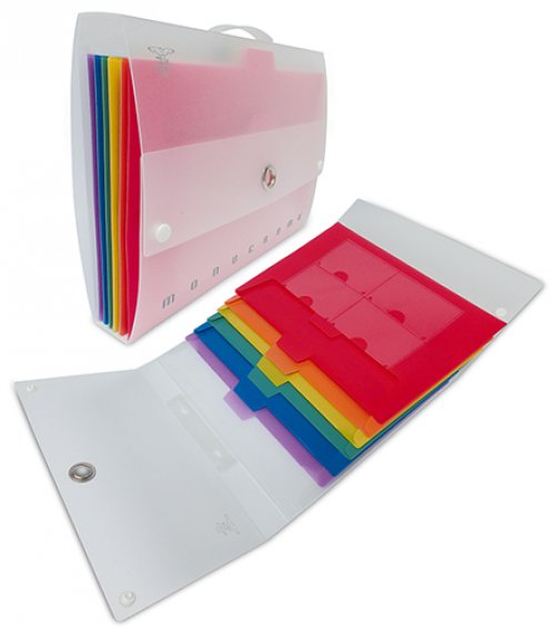Teczka z rączką i przegródkami 0223686 Praktyczna teczka z przegródkami wykonana została z trwałego polipropylenu. Wymiary teczki wynoszą 34x26,2x3,5cm. Wewnątrz znajduje się 6 przegródek w różnych kolorach. Po otwarciu teczki przegródki rozkładają się i całość można powiesić np. na ścianie przy pomocy otworu znajdującego się na górnej klapie. Teczka łatwo się składa, posiada rączkę, zamykana jest na plastikowe zatrzaski. Ostatnia przegródka ma cztery kieszonki przeznaczone np. na wizytówki, drobne zapiski. Zastosowany materiał polipropylenowy cechuje się trwałością i elastycznością. Zapewnia ochronę przechowywanych dokumentów. Monocromo to seria artykułów renomowanej włoskiej firmy Pigna. Cała kolekcja wyróżnia się klasyczną i uniwersalną kolorystyką. Użyte barwy wyrażają emocje, każdy odcień przyciąga uwagę i wywołuje określone uczucie. Cechą monochromatycznego stylu jest prostota i umiar, co czyni całą kolekcję elegancką i wszechstronną. Użyte kolory sprawiają, że całości nabiera uniwersalnego tonu i dzięki temu artykuły z serii Monocromo nadają się do biura, szkoły oraz codziennego użytkowania.Specyfikacja techniczna