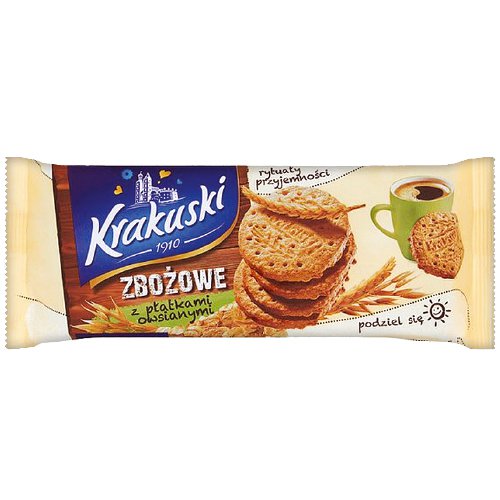 Ciasteczka zbożowe, to tradycyjna receptura zawarta w przepysznym ciasteczku. Bogate w błonnik składniki, takie jak mąka pełnoziarnista i płatki owsiane sprawiają, że produkt jest niepowtarzalny. Krakuski ciasteczka zbożowe, to smakowity dodatek do herbaty, kawy, po smacznym obiedzie. Sprawdzą się podczas niedzielnego popołudnia, w pracy, na spotkaniu, zawsze wtedy, kiedy nadejdzie ochota na coś smacznego, delikatnego, chrupiącego.Siła tradycji marki Krakuski