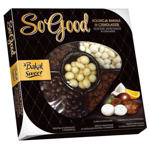 mieszanka bakalii i orzechów w czekoladzie BAKAL So Goodekskluzywna mieszanka bakalii i orzechów w połączeniu z czekoladą mleczną, deserową i białą oraz z przyprawami